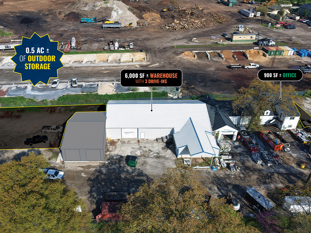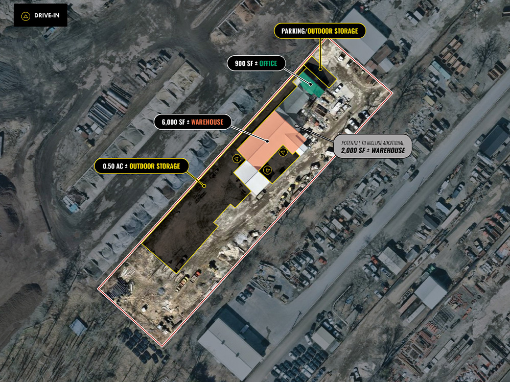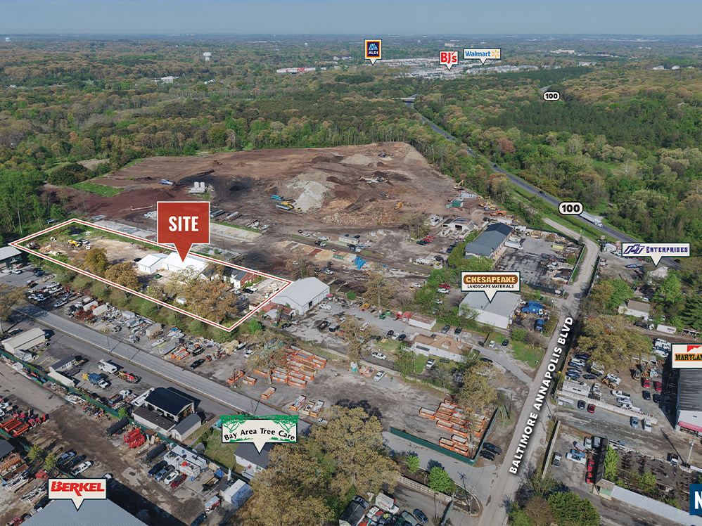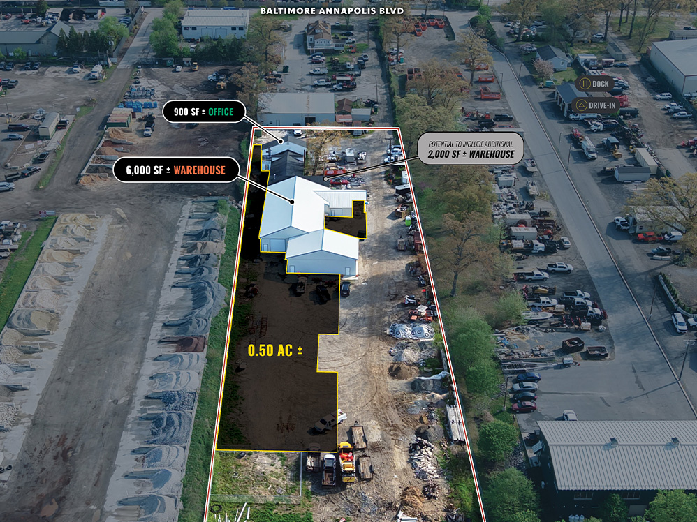 6,900 SF ± warehouse with office space available for lease at 8223 Baltimore Annapolis Boulevard in Pasadena, Maryland. The property includes 6,000 SF ± of warehouse space with three at-grade drive-ins and 900 SF ± of office, along with 0.50 AC ± of paved and graveled outdoor storage. Positioned with convenient access to Route 100, Route 2 (Ritchie Highway), and I-97, the site supports efficient regional connectivity. An additional 2,000 SF ± of warehouse space with one drive-in may be made available. Ideal for light industrial users requiring outdoor storage for materials or vehicles.