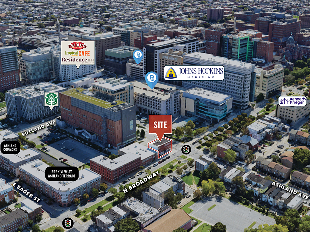 This 8,160± SF elevator-served office building is located on a 0.16± acre corner lot at the signalized intersection of N. Broadway and Ashland Avenue in Northeast Baltimore. The property includes a fenced, gated rear parking lot with approximately 10 dedicated spaces. Its prominent corner visibility and proximity—within walking distance—to The Johns Hopkins Hospital make it an excellent opportunity for office, medical, or institutional use.