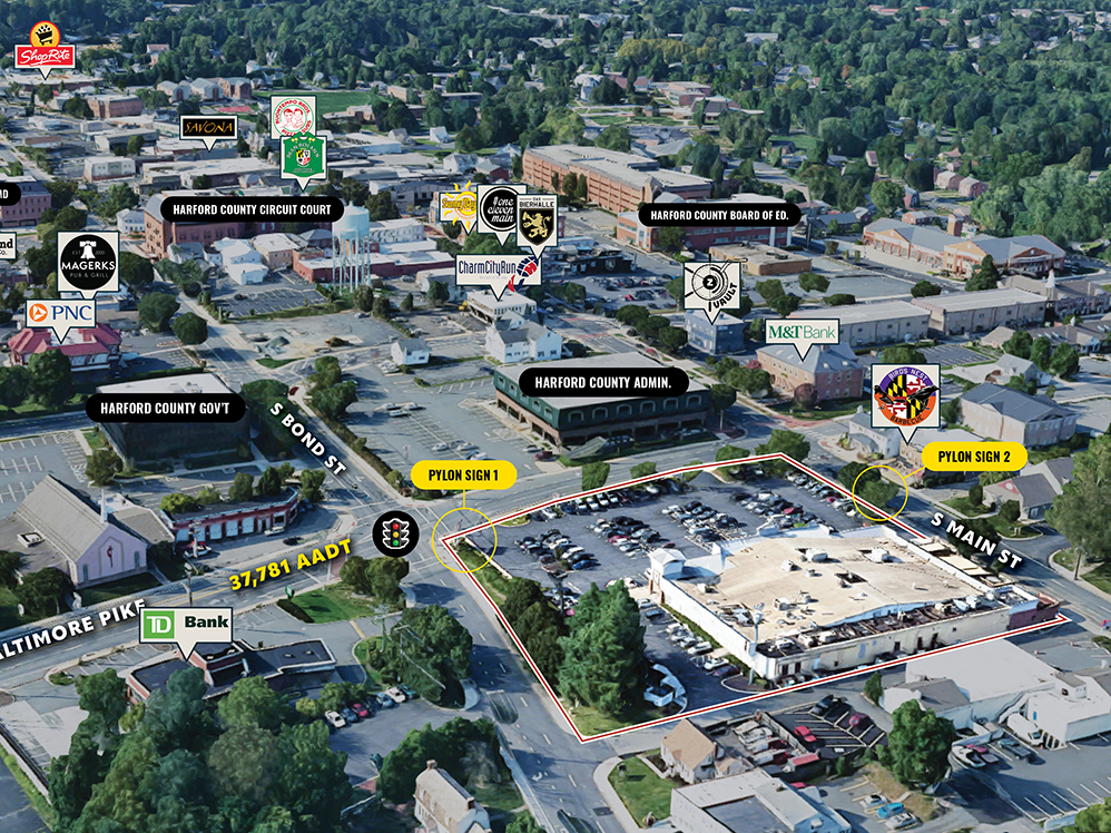A 2,997 SF ± retail end cap is now available for lease at Main Street Centre, located at 306 S. Main Street in the heart of Downtown Bel Air. Formerly a 7-Eleven, this high-profile space features existing freezers, cold storage, and two bathrooms, offering a turnkey opportunity for retail or food-related uses. The center boasts prime visibility at the area’s “Main & Main” intersection, with strong co-tenancy from Looney’s Pub, Margherita Pizza, and ZIPS. Tenants will benefit from building and dual-pylon signage, ample surface parking, and convenient access from both S. Main Street and Baltimore Pike at a signalized intersection—making it a unique chance to establish a strong presence on Bel Air’s Main Street.