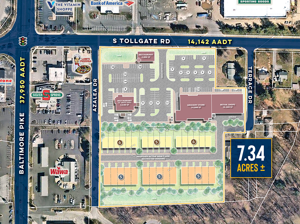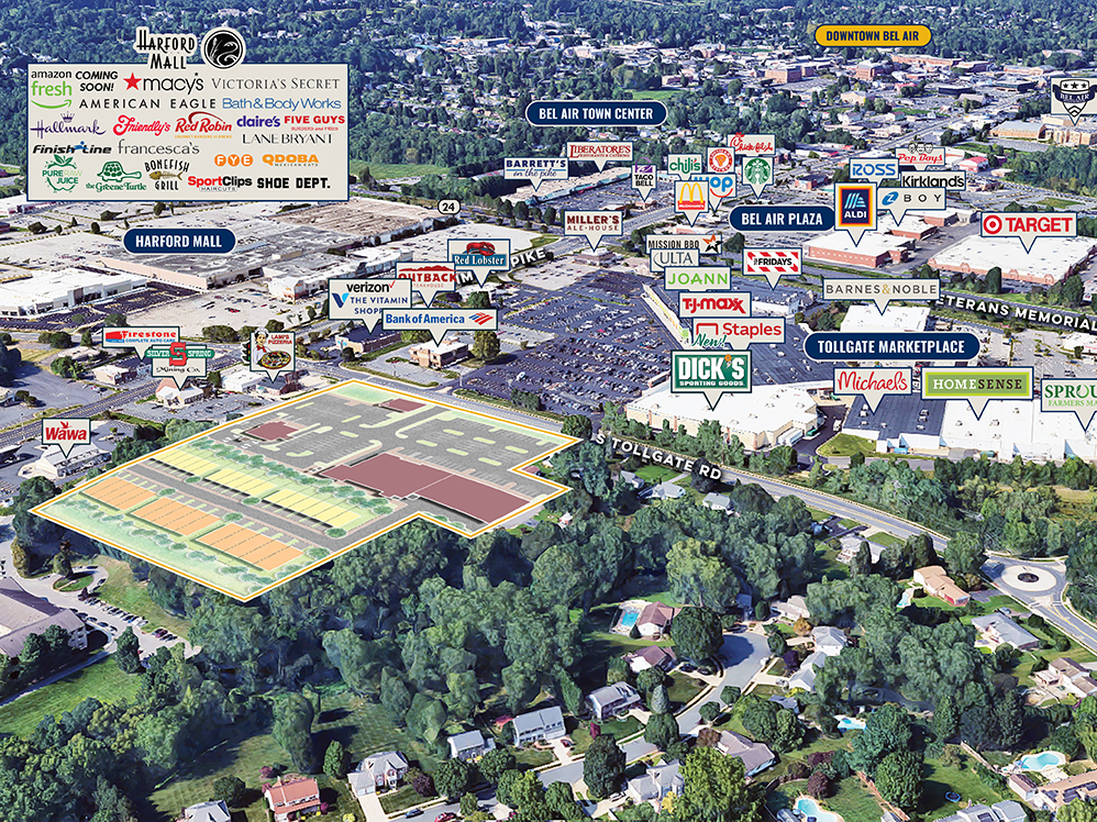 MacKenzie Retail, LLC is pleased to present the opportunity to lease retail/restaurant space at the proposed "Tollgate Centre" in the heart of Bel Air. This newly anticipated project is located in Bel Air's retail/commercial epicenter, which includes the Harford Mall, Bel Air Plaza Bel Air Town Center, and Tollgate Marketplace, which sits directly across from this project. Tollgate Centre, visible from heavily trafficked Baltimore Pike, will also enjoy tremendous frontage on S. Tollgate Road. The center is surrounded by dense, affluent neighborhoods, and is within walking distance to the University of Maryland Upper Chesapeake Health hospital. Medical/office space is also available.